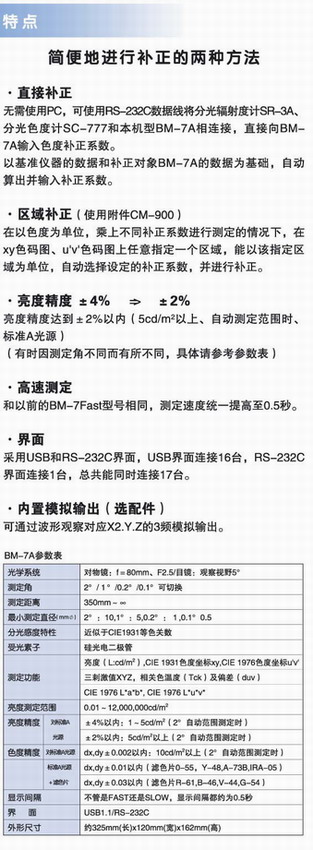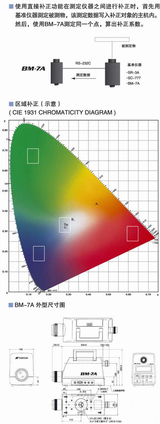 • Topcon BM-7A是亮度色度计,是以高精度的方式来量测,像CRT、LCD、LCD背光、LED或其它由物体表面着色、印刷材料的反射光。 采用三色值过滤的测定方法。可测定亮度、色度、色温CIELAB、