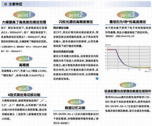 * 大幅缩短测定时间。如果亮度在100cd/m2只需大约1秒,即使在1 cd/m2更多也只需约30秒便能完成高速测量便能完成高速测量;