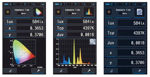 相关色温Tcp、与黑体Δuv的差异、XYZ、xy、u'v'、特征波长λd、色纯度Pe、光谱辐射照度、EV、CRIRa、Ri)、峰值波长λp、曝光值