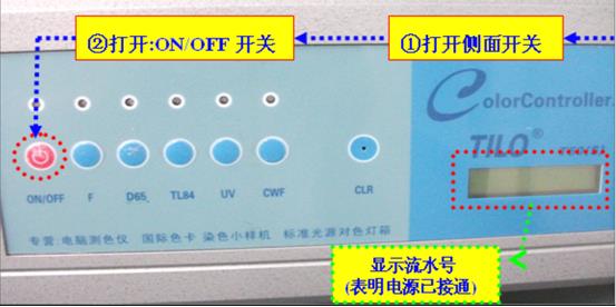 2 仪器开机:按一下侧面的开关键,将数字键打到“1”处(此时显示器会显示一个流水字母.表明电源已接通)。再按一下键面:ON/OFF 按键,此时显示器会显示该灯箱使用的总时间。