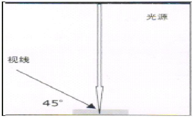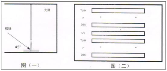 5 观察方法:观察角度以90度光源,45度视线为宜(如下图所示)。光线从垂直角度入射到被测物品上,观察者距离30CM 进行观看(厂内正常使用标准灯光D65灯光)。