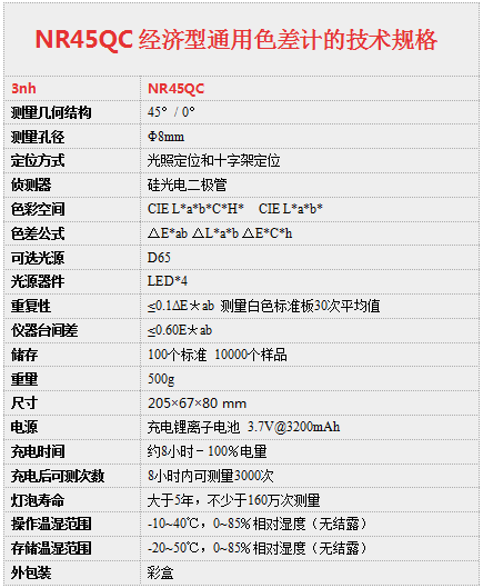 NR45QC是3nh色差仪继高品质、高性价比系列之后,推出的经济型通用色差计,后缀QC是Quality Control的缩写,中文意思是“品质控制”,突现了该机型的广泛用途。