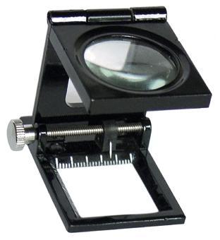 10倍三折式放大镜(金属框) 适用:印刷人员看网点密度,纺织行业对织物密度,电子工程师对细微元件,元件密集的线路板进行观察和检验或者医务人员、美容师需要照明放大的工作。 产 品 介 绍 10倍三折式放大镜(金属框、带指针)